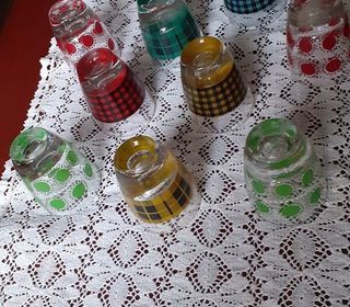 Vends un lot de petits verres originaux. Hauteur : 5 cm Diamètre le plus large : 4 cm.