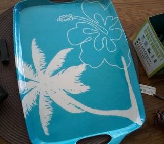Vend très beau plateau l 40 environ couleur bleu turquoise avec motif blanc 1 arbre et une fleur poignet de chaque côté tbe rien impeccables peu servi par téléphone uniquement