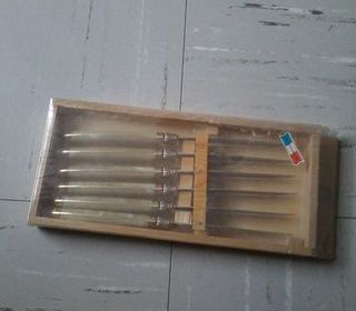Vend coffret en bois avec 6 laguioles marque française, certifiée sur la lames du couteaux marqué laguioles, neuf jamais servi encore dans emballages, va au lave vaisselle