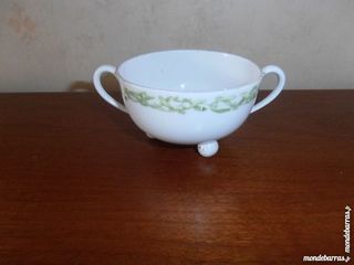 Sucrier en porcelaine de Limoges, avec 3 petits pieds en forme de boule. Peut aussi servir de vide-poches, de récipient pour les sachets de thé, etc. Dimensions : Dia