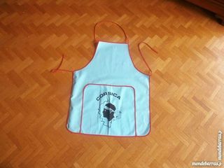 Très joli tablier bleu ciel avec bordures rouges, très grande poche sur le devant avec maure et inscription Corsica. Dimensions : 59 cm x 46 cm (sans les liens). Excelle