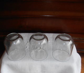 Ensemble composé de 3 verres transparents, en verre épais, de forme ovale, dimensions : hauteur 9 cm, diamètre 7 cm. Peuvent aussi faire de jolis photophores tels quels ou