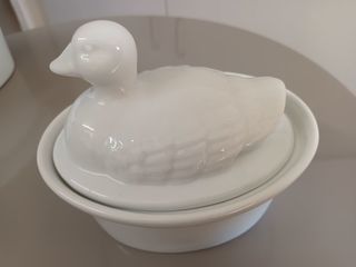 terrine blanche porcelaine ovale diamétre 15 cm intérieur 12.5 largeur 12 cm intérieur 9.5 hauteur 7 cm état neuf hauteur avec couvercle 14 cm