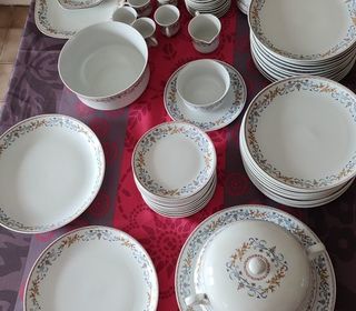 Service de table porcelaine de marque Ionia Hellas (manufacture grecque) datant des années 70. Excellent état. 84 pièces comprenant 24 assiettes plates, service à café complet. Fo