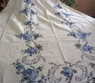 nappe brodée main, en coton couleur vert très pale broderie bleue et vert, aucune tache en parfait état,2m58x1m60; 12 serviettes 41cmx39.