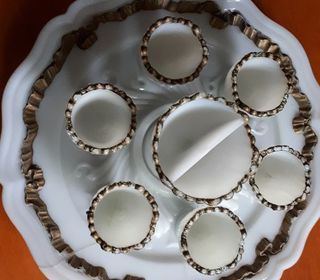 A VENDRE SERVICE 6 " ?ufs coque " + Salière / poivrière Plat de présentation Vintage opaline blanche et dorure A PRENDRE ET PAYER SUR PLACE