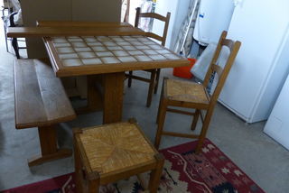 Une table en bois massif carrelée, 2 chaises en chêne assise paille,1 tabouret en chêne assise paillée, un banc en bois massif encastrable, 2 dossiers à suspendre en bois massif