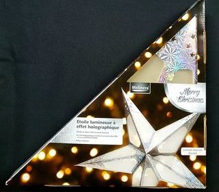 Grande étoile lumineuse à effet holographique Diamètre : 58cm 10 LED Longueur de câble : 10m Vendue avec anneau de suspension et mode d'emploi Article neuf, non déballé Annon
