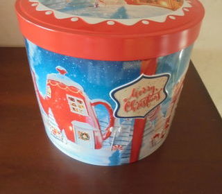 Très belle boite en métal, aux motifs de Noël, entièrement décorée à l'extérieur et sur le couvercle, motifs eb relief, très belles couleurs dans les tons de Noël, incription