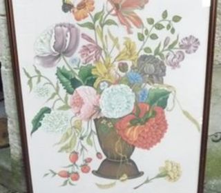 Tableau un exemplaire fait main, ancien, fleurs peintes sur toile 1m15/90cm, plaque de verre, entourage bois. à prendre sur place. JE BRADE
