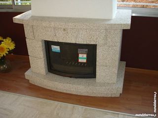 <strong>Vends cheminée en pierre granit beige de forme arrondis + un insert de marque Deville .Prix pour l'ensemble .La pierre a une finition sablée </strong>
