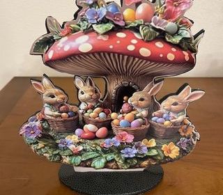 Belles figurines de Pâques représentées par de mignons lapins avec leurs oeufs. Ces pièces sont faites en cartonnage, montées sur un socle noir pour assurer une bonne stabilité. Id