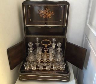 Cave à liqueur galbée style Napoléon III Très décorative cave ouverte En marqueterie bois, ivoire Manque le motif du couvercle ( voir photo ) Bordure en laiton Charnières