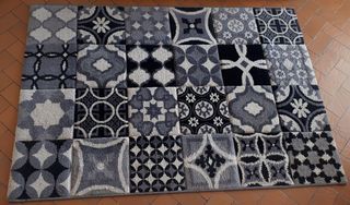 Tapis de salon au design moderne et géométrique - Couleurs : Gris, noir et blanc - Dimensions : 120 x 170 cm environ - Motif : Géométrique patchwork Bon état