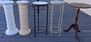 A vendre à Marmande, 5 guéridons : 2 colonnes terre cuite (1 blanche + 1 saumon) 2 guéridons structure acier, 1 guéridon en bois, hauteur 60/62cm. 15€ le lot . Pas d'expédition, re
