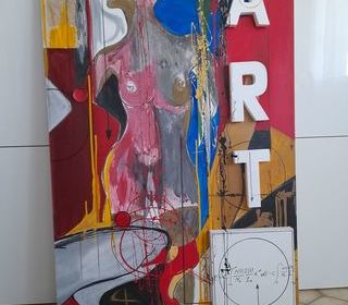 TRES GRANDE PEINTURE sur TOILE clouée sur cadre en bois prêt à être accroché (vis fournies) largeur 89 cm x H1,30m x ép.2,5 cm Lettres A - R - T en relief, ainsi que la boite e