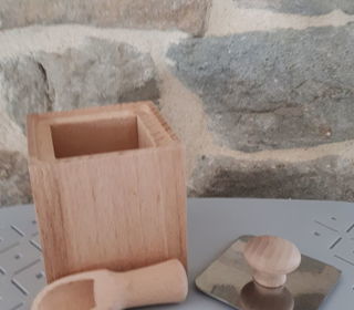 Salière en hêtre forme carré avec cuillère. Neuf .hauteur 6.5 cm. Largeur 6 cm