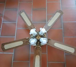 Vends Ventilateur de plafond rétro à 5 pales en bois avec 4 lampes Corps du ventilateur métallique laiton Chaînette pour allumage/extinction lumière Chaînette pour marche/arr