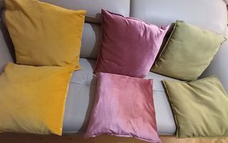 Lot de six coussins - trois couleurs. Dimensions 45 x 45cms Tous sont des modèles lavables. Ils sont propres. Ils ont tous une fermeture éclair pour permettre le lavage des hous