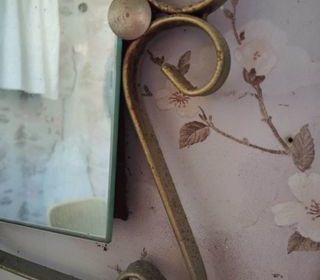 miroir trapézoïdal à entourage fer forgé couleur doré. Quelques points de corrosion à rénover ou non suivant vos désirs et goûts