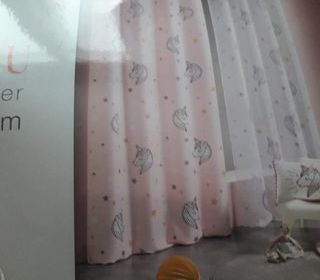 double rideaux neufs marque LILI ROSE fond rose /mauve avec motifs licornes dimensions140X260 chacun avec anneaux métal argent tissu polyester idéal pour une chambre d'enf