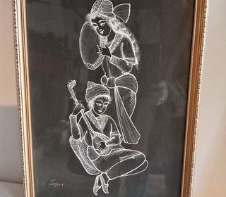 Tableaux encadrés sur fond noir , protégés par un sous verre , représentant deux musiciens .et un guérisseur avec sa patiente 28cmx37cm Bon état remis en main propre à Fle