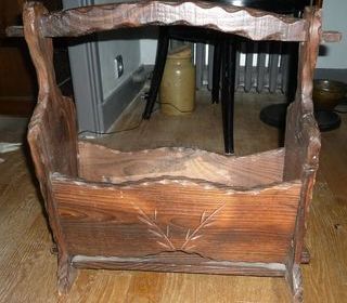 Porte revues en bois massif avec motifs sculptés Dimensions : longueur 49 cm Largeur 17.5 cm Hauteur 48 cm très bon état