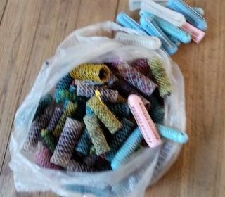 Lot de bigoudis en plastique de différentes couleurs, avec plusieurs pinces assorties, vendu dans un sac plastique. Idéal pour réaliser des coiffures avec des boucles.