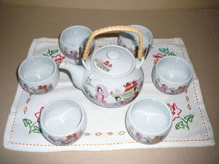 service à thé traditionnel et son napperon en lin comprenant la théière ( ou cafetière ou tisanière ) et 6 tasses aucune ébréchure anse impeccable comme NEUF: jamais utilisé d
