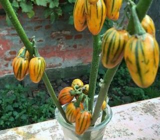 Variété africaine qui produit des petits fruits de 7/8cm de couleur jaune orangé zébré de vert. Se conserve très bien, goût fort et affirmé, exposition ensoleillée, culture en pot