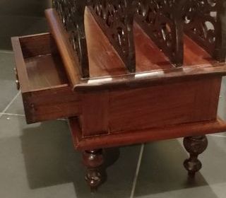 Il s'agirait d'un ancien porte revues en bois. Il est resté dans son jus, simplement bien nettoyé, passé à la protection en bois et lasure incolore. Produit impressionnant, style