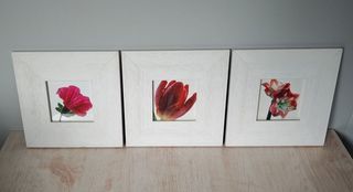 3 tableaux Thème : Les fleurs Cadre en bois blanc Dimensions cadre Largeur 25.5 cm Hauteur 25.5 cm Epaisseur 1.5 cm Dimensions toile Largeur 11 cm Hauteur 11 cm En exce