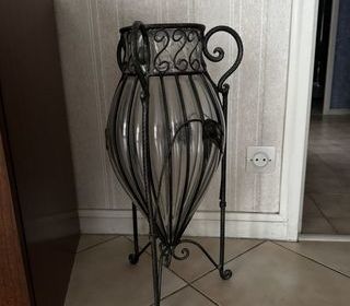 Je vends ce vase sur pied en fer forgé et verre. H57 base 25 intérieur 13 - Type de produit : Vase sur pied - Matière : Fer forgé et verre - Style : Vintage / Industriel Bon ét