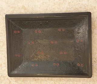 Ancien plateau en bois gravé noir et rouge Mexicain 18,6 X 24,6 cm Etiquette " Hecho en Mexico " Dimensions : 18,6 X 24,6 X 2,3 cm 274 g Très bel objet artisanal rapporté de vo