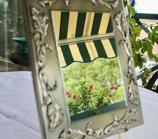BEAU M I R O I R encadré E T A I N Création ARTISANALE ETAIN garanti "titre légal 98% DIMENSIONS -Totale : 34 cm X 28 cm -du miroir : 23 cm X 17 cm Poids : 1,400 Kgrs ETAT