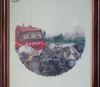 Tableau d'un dessin de pompier au travail, sous verre, encadré de pourpre et d'une bande dorée, 35.3 x 45.4 cm, accroche au dos. Dans son emballage blister un peu éraflé, neuf, enc
