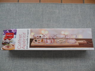coffret apéritif imaginéa neuf ,jamais ouvert a 7 euro . 1support en bambou 36,5 x 8,5 cm et 4 coupelles en verre 6,7 x 5 cm.
