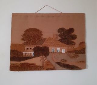 Peu courante, déco murale style tenture en grosse toile (style jute) dont les teintes varient autour du beige Dimensions : L 1m × H 0,80m