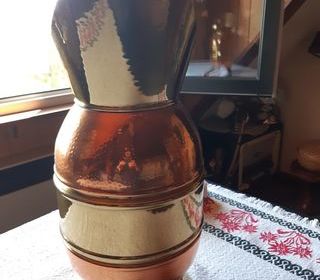 Broc en cuivre 2 tons en bon état. Hauteur 46 cm environ. Largeur 34 cm et le diamètre du socle est de 18 cm. A récupérer sur Bischwiller et à régler sur place.