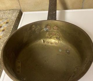 USTENSILE ANCIEN cuivre et bronze Diamètre 25 cm ? profondeur 11 cm ? manche 28 cm. PRIX 9 €uros.
