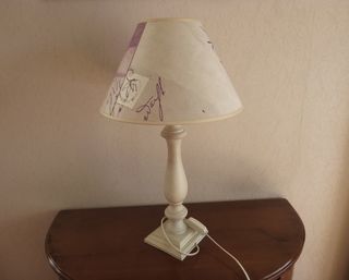 Jolie lampe en parfait état, hauteur 55 cm, pied en bois peint. Selon le positionnement, couleur rouge clair/mauve/rose ou blanc/écru/naturel, ambiance chaleureuse. Vendue sans l