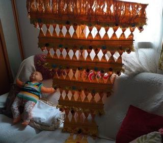 DECO BRESILIENNE MURALE h 1.40 larg 0.96 Décorative traditionnelle en tissu orange ornée de pompons multicolores. Idéale pour ajouter une touche ethnique et colorée à votre in