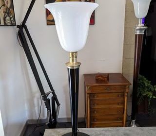 lampe art déco MAZDA laquée noire avec tulipe en opaline et en bon état. D'époque art nouveau art déco vers 1930. Hauteur 78 cm diam 25 cm. Avec la douille E27 a tirette qui fo