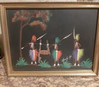 1 Tableau Afrique signé, origine Cote d'Ivoire, format 21x27 cm, sous verre, cadre bois, très bon état -