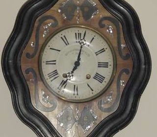 Horloge Murale Bois avec Cadran Décoratif. Miroir mural en bois avec cadre arrondi au sommet. Couleur marron avec finition polie. Quelques touches nacrées.. Parfait pour ajouter