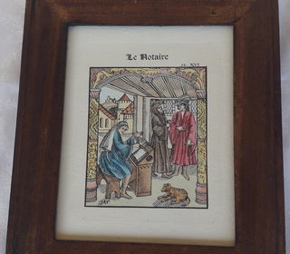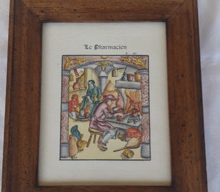 "vintage Français années 80 Reproduction Colorée à la Main Imprimé Style Médiéval Image Encadrée d'un Chimiste Signé GAF, Rétro Château Style Décor France 21,5 x 25,5 cm"