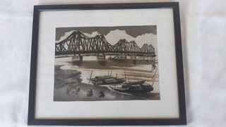 "pont Doumer Hanoï peinture sur soie années 50 cadre bois noir 31 x 26 cm"