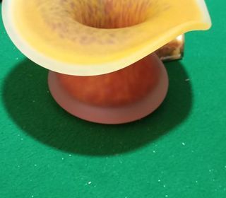 Superbe vase en pâte de verre mordorée dans les tons orange à rose. Production de la verrerie de Toul. État neuf voir photos. Hauteur 11 cms diamètre 16. Poignée en pâte incolore.