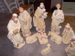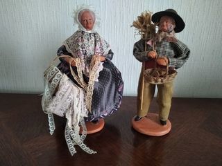 2 grands santons de provence artisanaux en terre cuite, signés : Simone Jouglas (1907-2001), célèbre santonnière. Une dentellière et un paysan.Très bon état, peints à la main et no