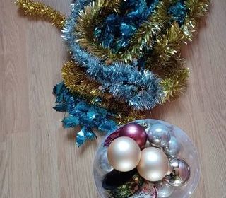 vend lot de décoration de Noel ; guirlandes de 2 mètres; 1 argentées et 2 dorées ; 1 euro pièce ou 2 euros le lot 28 boules grises ; 2 euros le lot 5 suspensions motif éto